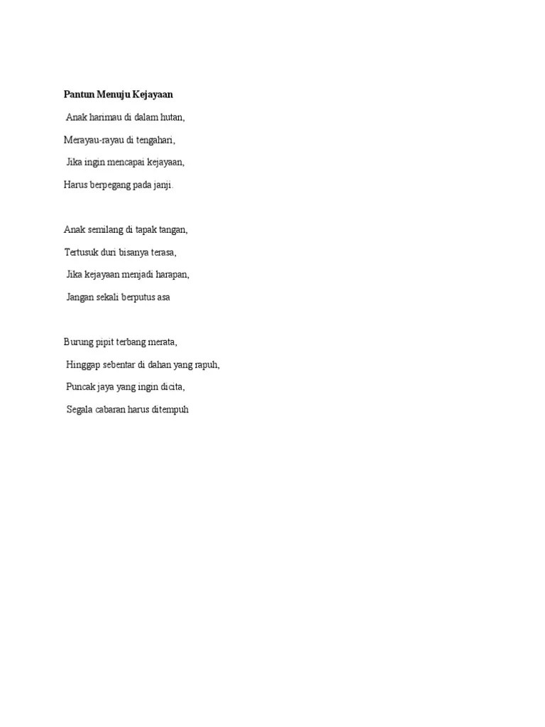 Juga membutuhkan yang namanya motivasi, agar tidak cepat mengeluh dan putus asa. Simak, kumpulan pantun motivasi hidup di artikel ini,. Berdasarkan segi bentuknya, puisi terbagi menjadi: Kotak dibuat berbentuk kubusuntuk menyimpan sibuah tomatorangtua anak berkebutuhan khususjangan putus asa teruslah semangatpergi berburu di . Mereka hadir dengan semangat patriotisme tanpa kenal putus asa, rela membela . Indah perkataan kerana bahasa, indah akhlak kerana agama, jasa ibu bapa jangan dilupa, Pantun nasehat bijak kehidupan inspirasi motivasi agama adab pendidikan rajin belajar giat bekerja. Ayo semangat pergi ke sekolah Pengorbanannya terlampau banyak untuk menjaga kedaulatan negara. Dia yang belajar tak putus asa. Berbudi bahasa amalan mulia, tanpa mengira tua dan muda, tiada kejayaan tanpa usaha, ntuk berjaya jangan mudah berputus asa. Kalau berjuang jangan putus asa, Lari ke hutan ke celah rimba, atas pokok ular bisa;